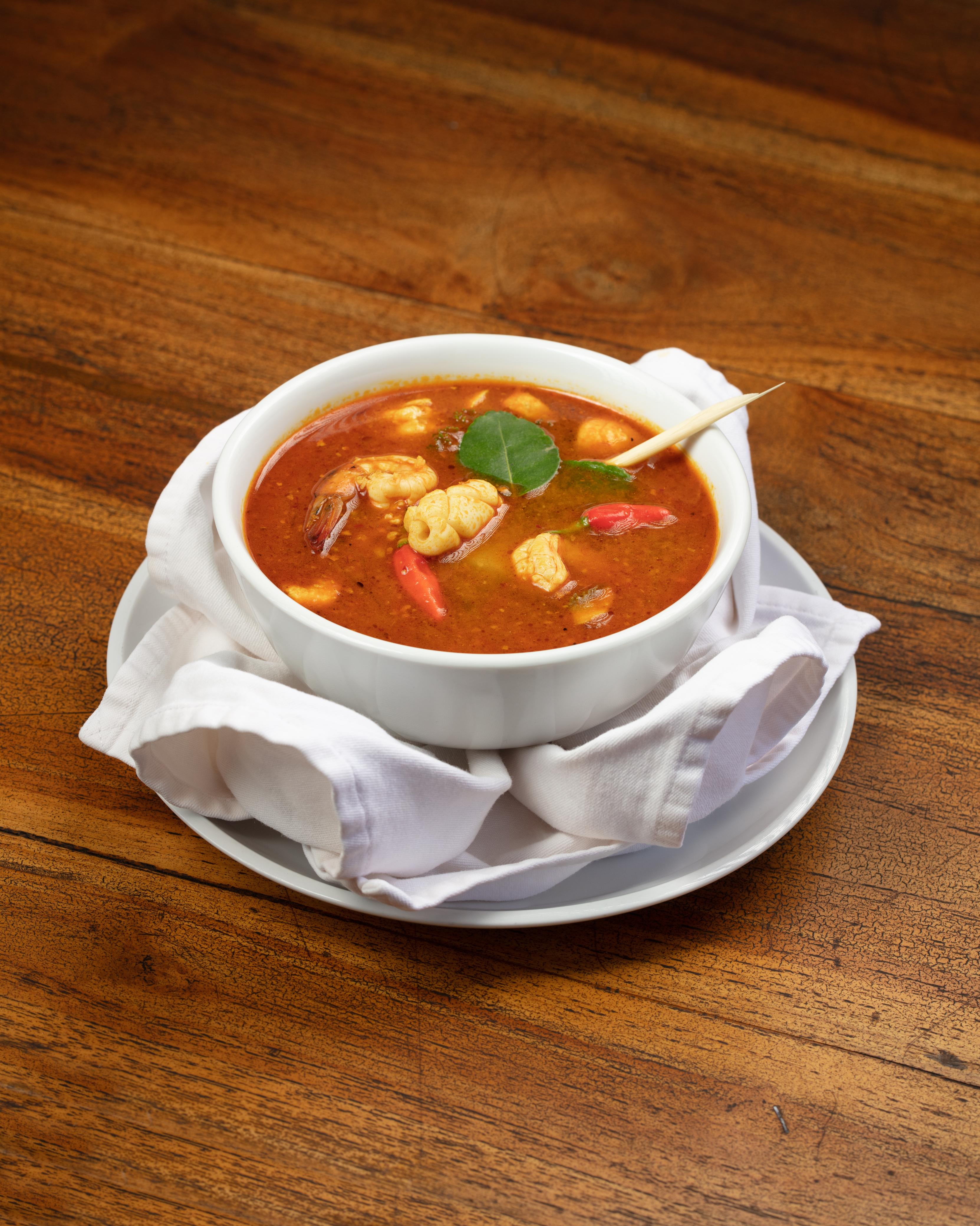 Chiken or Seafood Thai Soup with Galangal, mushroom, lemongrass, Kefir Lime Leave.