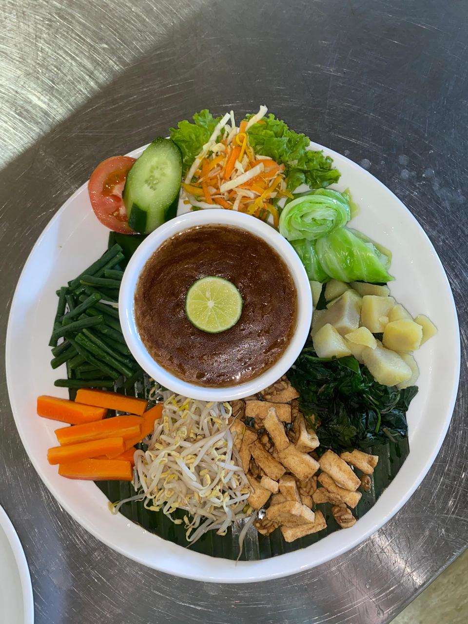 Made with mix Tempe and Tofu, Cucumber, Egg, Shrimp crackers, Long Beans, Spinach Water.