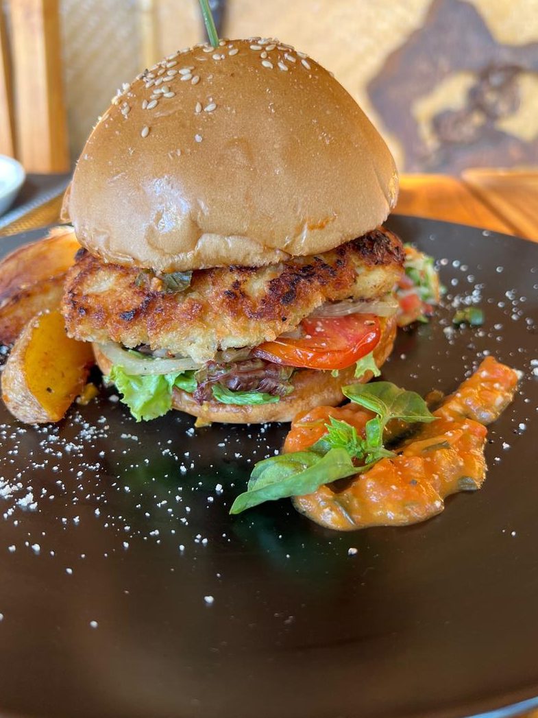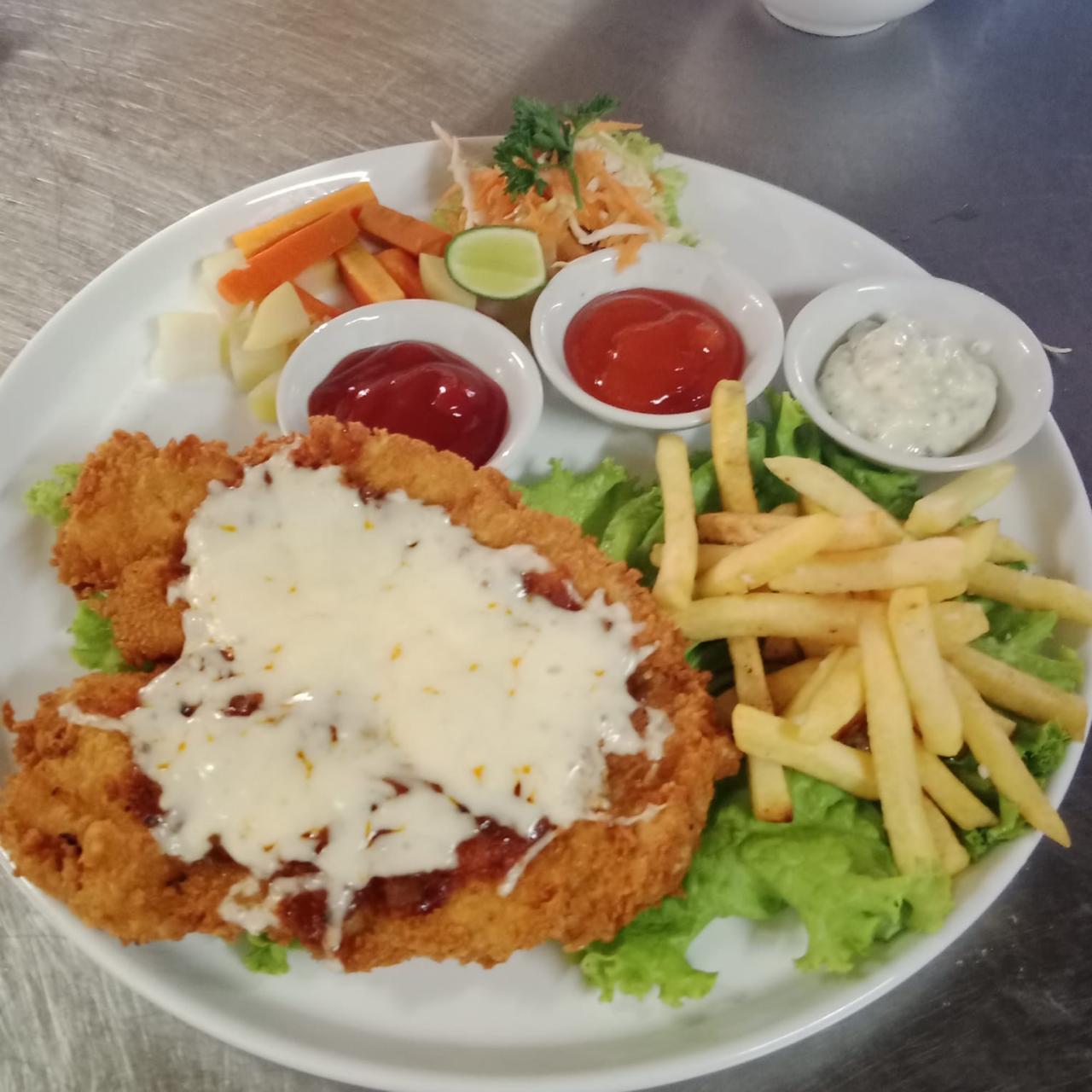 Chicken schnitzel served with chicken breast, mix vegetables, french fries and black pepper mushroom sauce